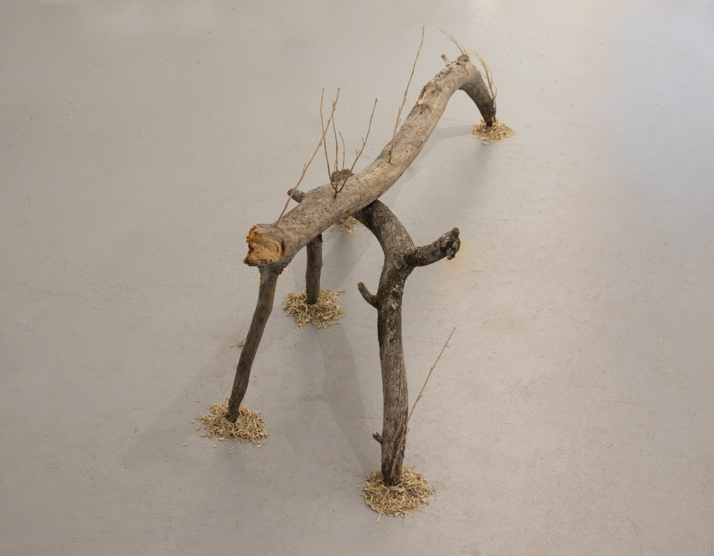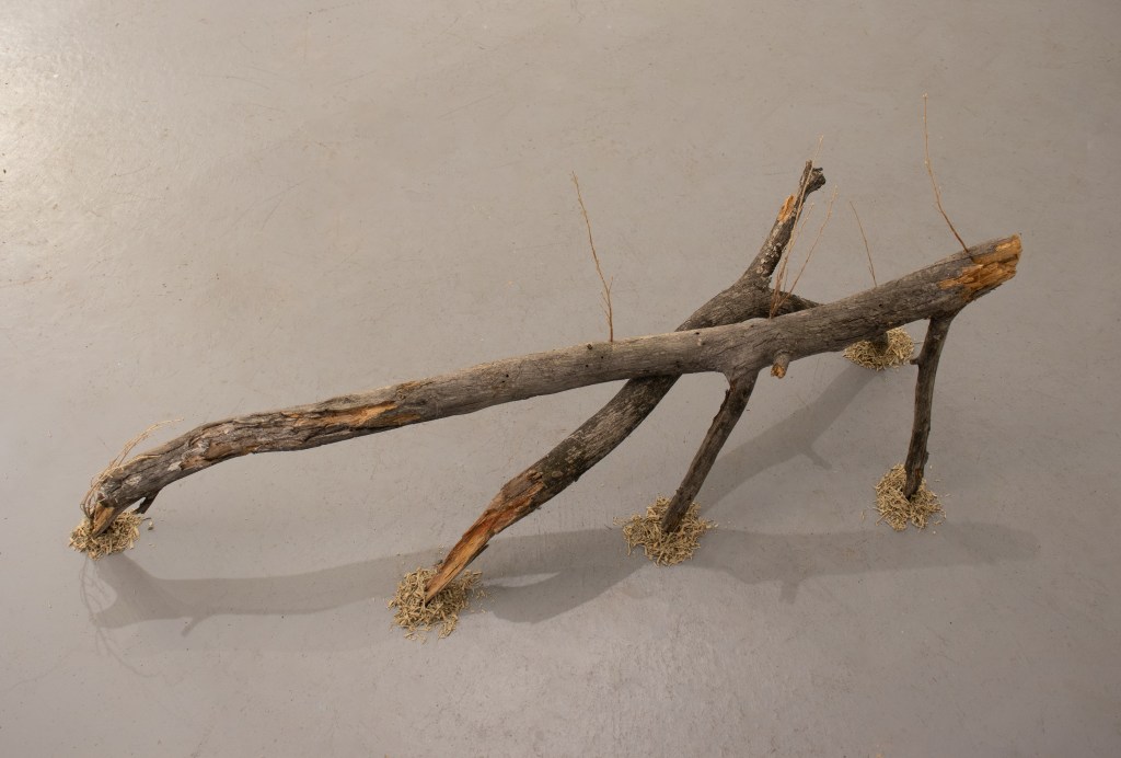 Constellation Beings arranges driftwood into walking forms, their grounded points resting in small circles of sand and sage. The titles trace the places their “legs” meet the earth, like stars forming constellations.